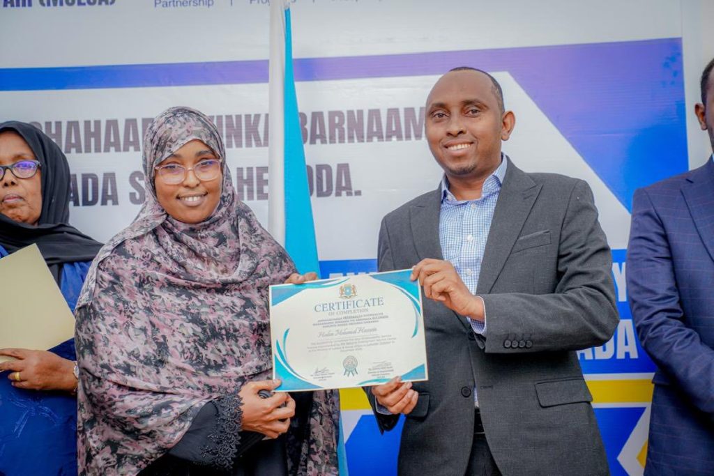 Xafladda abaalmarinta shahaadooyinka Barnaamijka tababarka adeegyada Shaqo-Helidda. Agaasimaha Guud ee Wasaaradda Shaqada iyo Arrimaha Bulshada XFS, Mudane Yussuf Wadani ayaa si