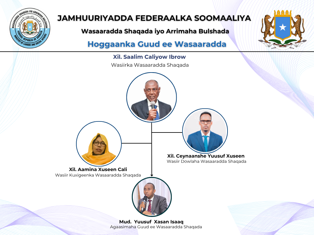 The Ministry of Labor and Social Affairs of the Somali Federal government is mandated to provide policy direction and guidance on all labour administration and vocational training matters. The Ministry is also mandated to protect and develop the labour force to contribute to the socio-economic development of the Somalia Federal Government.