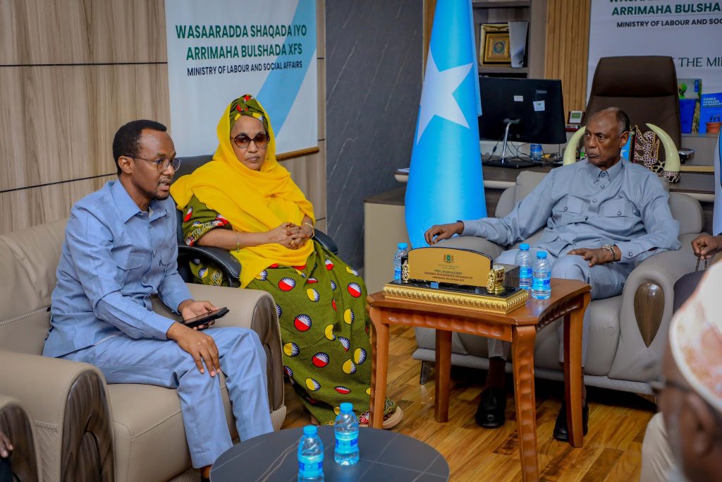 Wasiirka wasaaradda Shaqada iyo Arrimaha Bulshada JFS, Prof. Salim Caliyow Ibrow, ayaa xafiiskiisa ku qaabilay gudoomiyaha gudiga shaqaalaha rayidka iyo xubno ka tirsan gudiga.