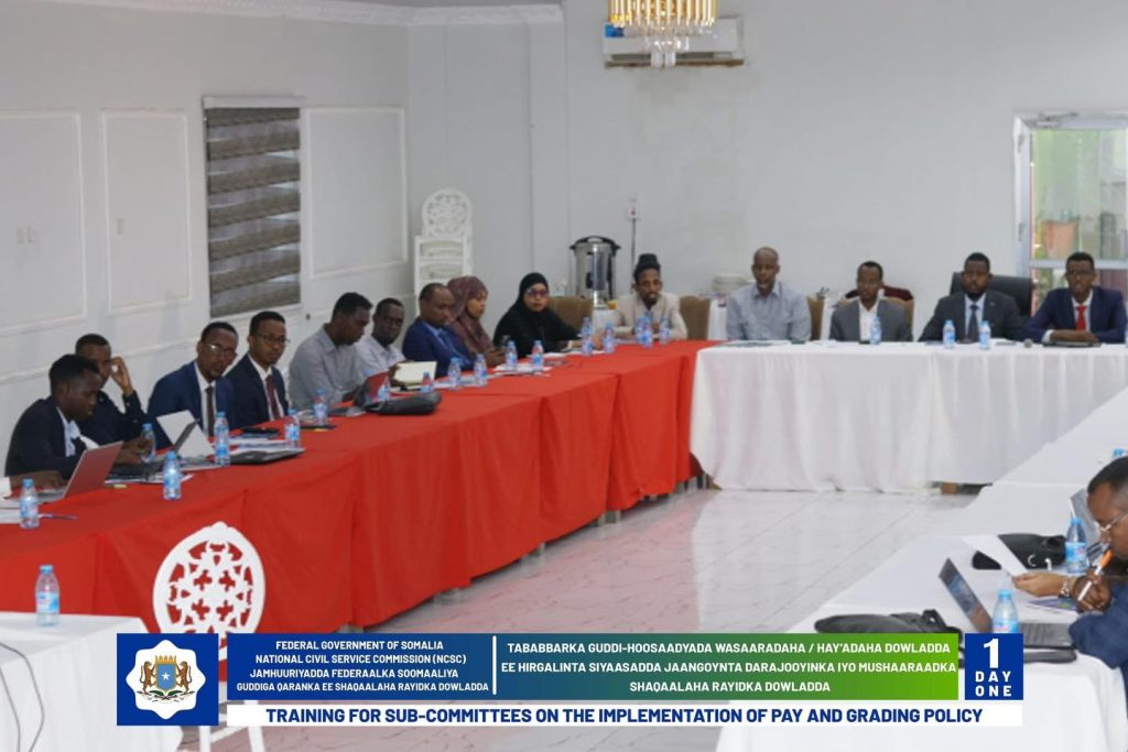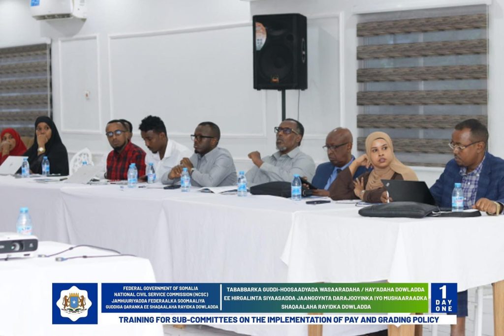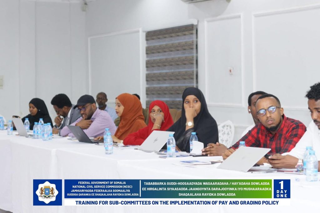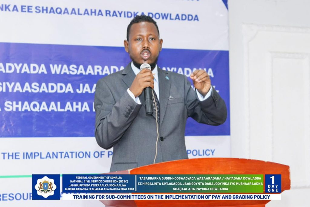 Wasiirka Wasaaradda Shaqada Iyo Arrimaha Bulshada oo daahfuray Tababarka Guddi-hoosaadyada Hirgelinta Siyaasadda Darajooyinka Iyo Mushaaraadka Shaqaalaha Rayidka ee Dowladda.