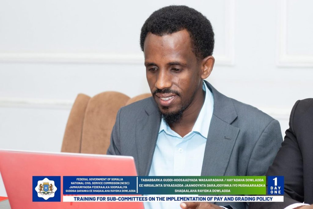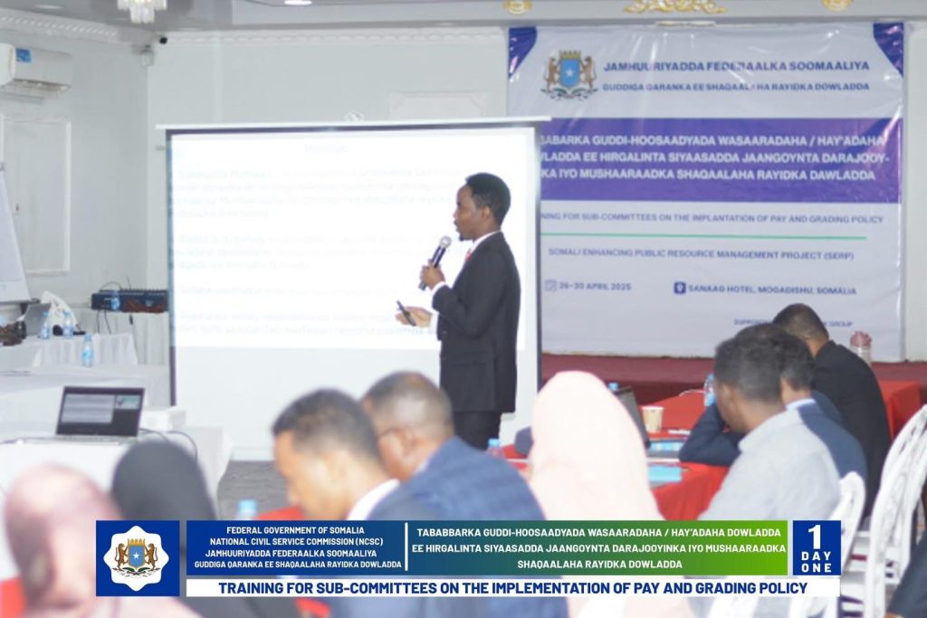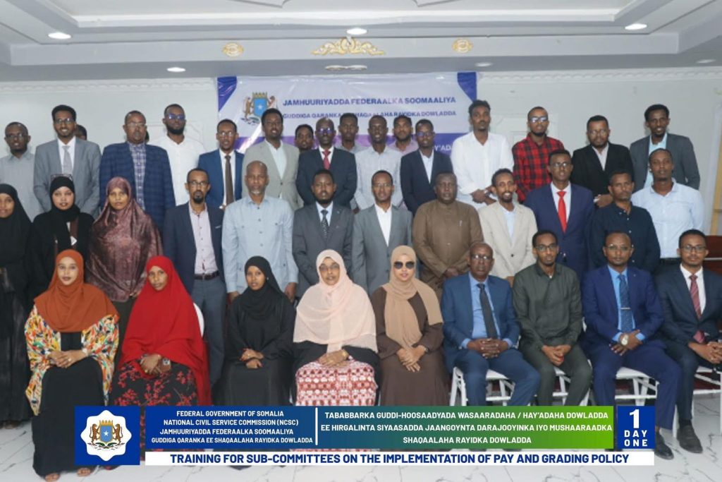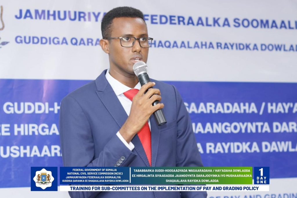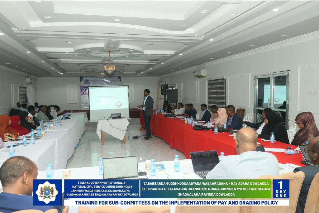 Wasiirka Wasaaradda Shaqada Iyo Arrimaha Bulshada oo daahfuray Tababarka Guddi-hoosaadyada Hirgelinta Siyaasadda Darajooyinka Iyo Mushaaraadka Shaqaalaha Rayidka ee Dowladda.